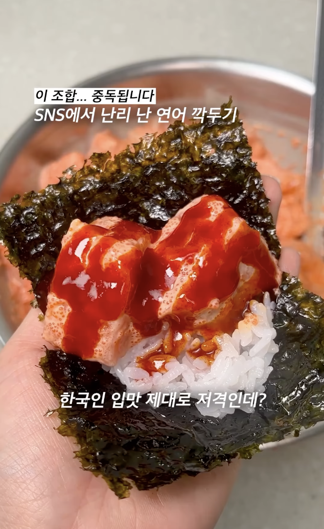 연어를 깍둑썰어 마요네즈, 스리라차 소스와 비벼 먹는 영상을 올렸다.